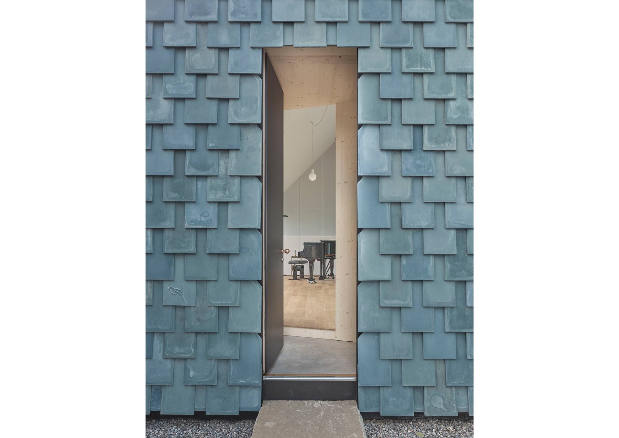 Pavillon ist volumetrisch an eine klassische Hausform mit Satteldach angelehnt,