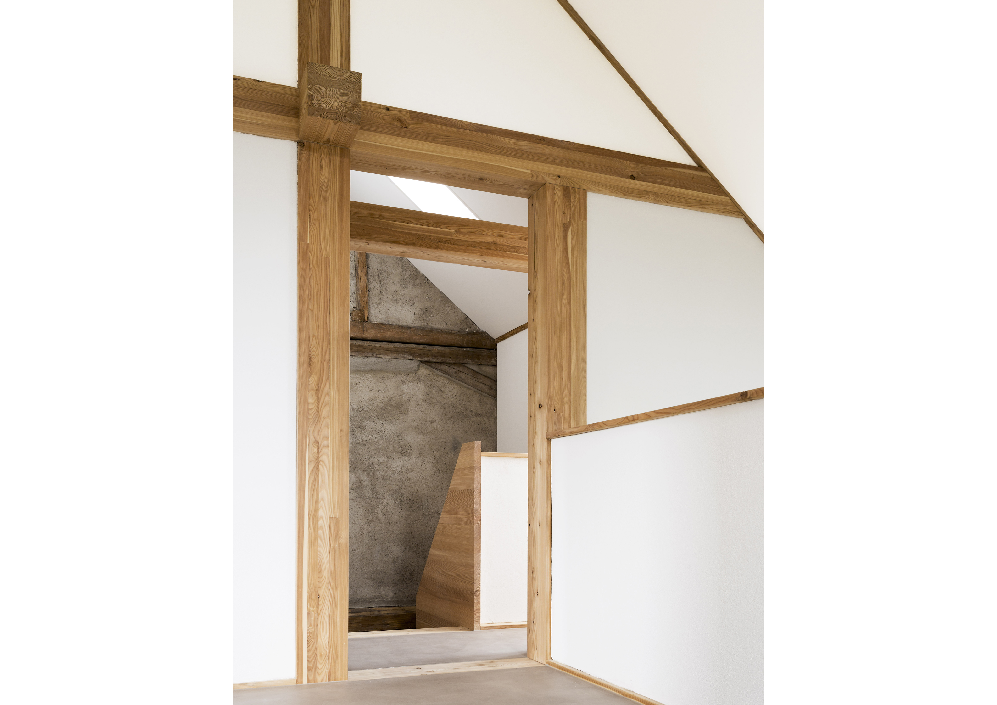 Mächtige Bruchsteinmauern und eine filigrane Dachkonstruktion bilden den Perimeter des Umbaus. In die leere Hülle wird eine Struktur aus tragenden Stützen und Balken gestellt, welche auf den Rücksprüngen der Aussenwände auflagert. Horizontale und vertikale Füllflächen wirken raumbildend und formen einen im Schnitt über drei Geschosse verbundenen Wohnraum. Im starren Raster des Bestandes, mit niedrigen Höhen und kleinen Fenstern, schafft die Wohnfigur eine überraschende Grosszügigkeit.
