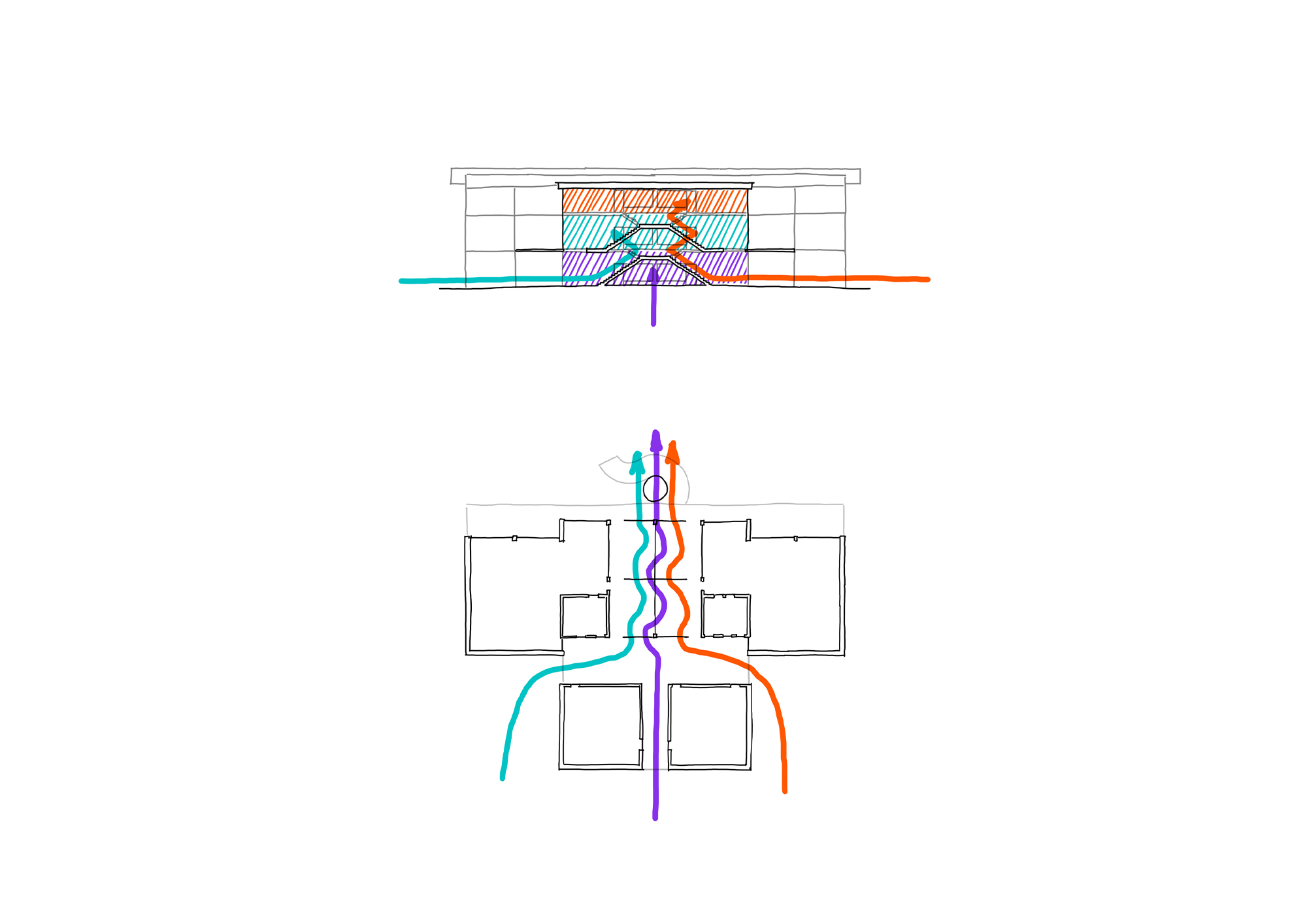 Drei Eingänge dienen als Filter, strukturieren die Ankunft der Kinder und ordnen diese direkt ihren Gruppen zu. Vorgelagerte Bauminseln und gedeckte Vorzonen erleichtern Orientierung und bieten Platz für wartende Kinder und Eltern. Das offene Treppenhaus verbindet die Geschosse spielerisch und fungiert gleichzeitig als Begegnungsraum.